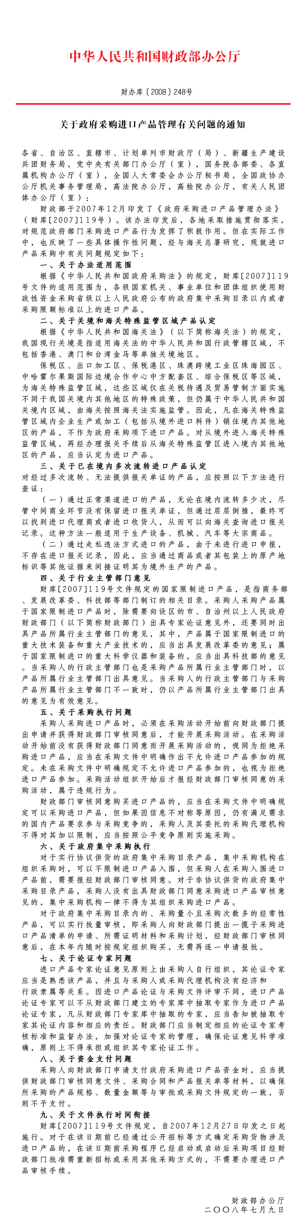 關(guān)于政府采購進(jìn)口產(chǎn)品管理有關(guān)問題的通知(財(cái)辦庫〔2008〕248號(hào))