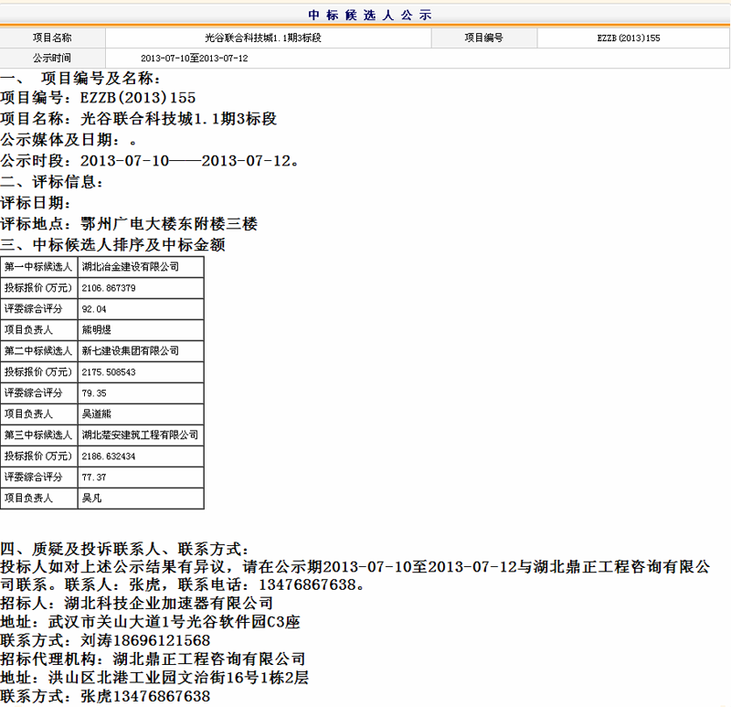 光谷聯(lián)合科技城1.1期3標中標候選人公示