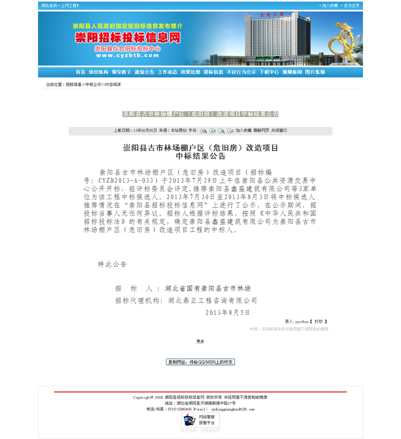 崇陽縣古市林場棚戶區(qū)(危舊房)改造項(xiàng)目中標(biāo)結(jié)果公告