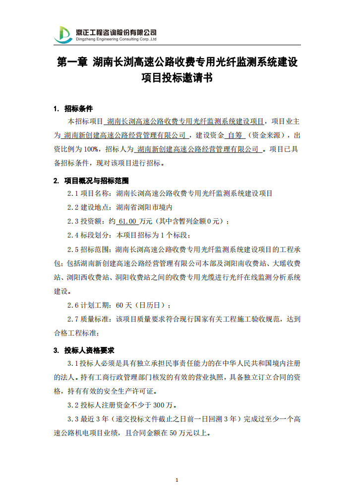 湖南長瀏高速公路收費(fèi)專用光纖監(jiān)測系統(tǒng)建設(shè)項(xiàng)目投標(biāo)邀請(qǐng)書