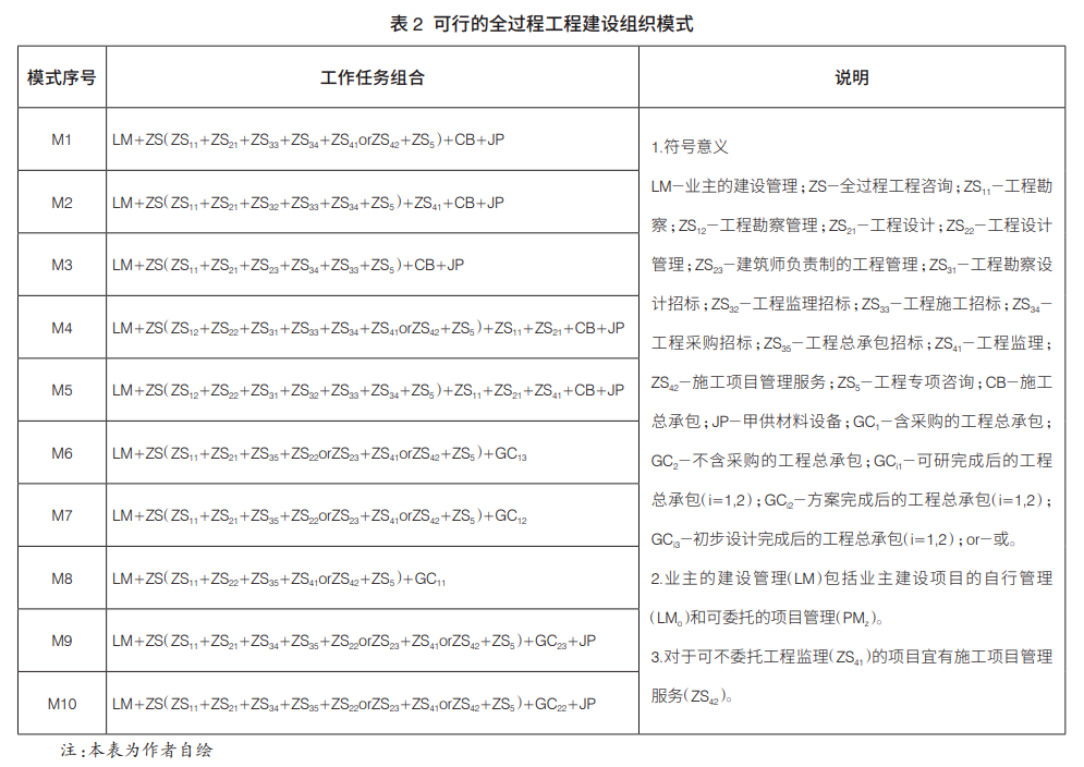 國(guó)家鼓勵(lì)多種形式的全過程工程咨詢服務(wù)模式,服務(wù)內(nèi)容可以是跨階段組合或同一階段內(nèi)不同類型的組合。據(jù)筆者調(diào)查,目前業(yè)界認(rèn)可度較高的全過程工程咨詢內(nèi)容主要包括勘察設(shè)計(jì)、招標(biāo)采購(gòu)、監(jiān)理與施工項(xiàng)目管理服務(wù)以及工程專項(xiàng)咨詢。其中,工程勘察設(shè)計(jì)咨詢分為工程勘察設(shè)計(jì)和勘察設(shè)計(jì)管理服務(wù)兩種類型;工程專項(xiàng)咨詢包括項(xiàng)目融資、工程造價(jià)、信息技術(shù)等業(yè)主所需求的咨詢服務(wù)?;谶@一認(rèn)識(shí),筆者梳理了建設(shè)、勘察設(shè)計(jì)、監(jiān)理、施工等單位在工程建設(shè)中的關(guān)系組合,并列出工程建設(shè)全過程主要的建設(shè)組織模式,如表2所示。