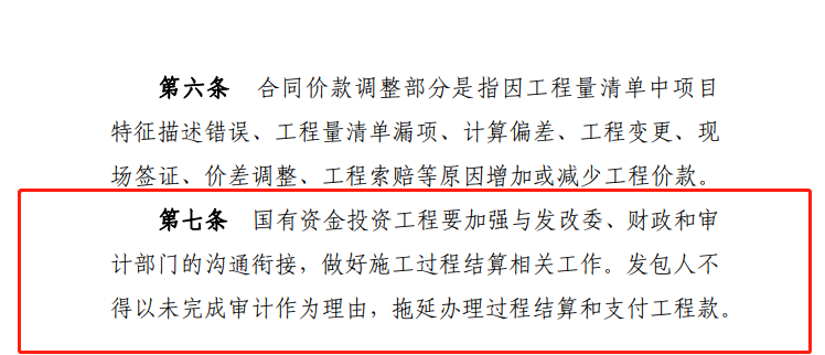 推行過程結(jié)算,建設(shè)單位應(yīng)滿足施工所需的資金安排,工程驗(yàn)收通過時(shí)原則上應(yīng)同步完成工程款結(jié)算,不得變相拖延結(jié)算。國有資金投資工程應(yīng)當(dāng)按照國家有關(guān)規(guī)定確保資金按時(shí)支付到位,不得以未完成審計(jì)作為延期工程款結(jié)算的理由。在以往的建設(shè)工程司法案例中,合同雙方若在合同中約定以行政審計(jì)后的價(jià)款作為結(jié)算價(jià)款的,法院予以支持。眾所周知,行政審計(jì)一般在項(xiàng)目驗(yàn)收完成之后進(jìn)行,那么在推行施工過程結(jié)算的背景下,發(fā)包人在招標(biāo)文件及合同條款中再約定以行政審計(jì)后的價(jià)款作為結(jié)算依據(jù)的,明顯與過程結(jié)算的推行意義相違背。