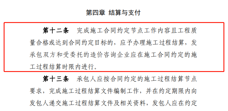 本條定義何為施工過程結(jié)算,相較住建部2021年發(fā)布的《建筑工程施工發(fā)包與承包計(jì)價(jià)管理辦法》(修訂征求意見稿)第十九條規(guī)定“全面推行施工過程結(jié)算和支付。發(fā)承包雙方通過合同約定,按時(shí)間節(jié)點(diǎn)或進(jìn)度節(jié)點(diǎn)對周期內(nèi)已完成且無爭議的工程量進(jìn)行價(jià)款計(jì)算、確認(rèn),并按照合同約定比例支付?!?span style=";margin: 0px; padding: 0px; outline: 0px; max-width: 100%;Helvetica Neue", "PingFang SC", "Hiragino Sans GB", "Microsoft YaHei UI", "Microsoft YaHei", Arial, sans-serif; text-align: justify; background-color: rgb(248, 248, 248); box-sizing: border-box !important; overflow-wrap: break-word !important;">《暫行辦法》增加了節(jié)點(diǎn)驗(yàn)收,驗(yàn)收是節(jié)點(diǎn)結(jié)算與支付的前提。
