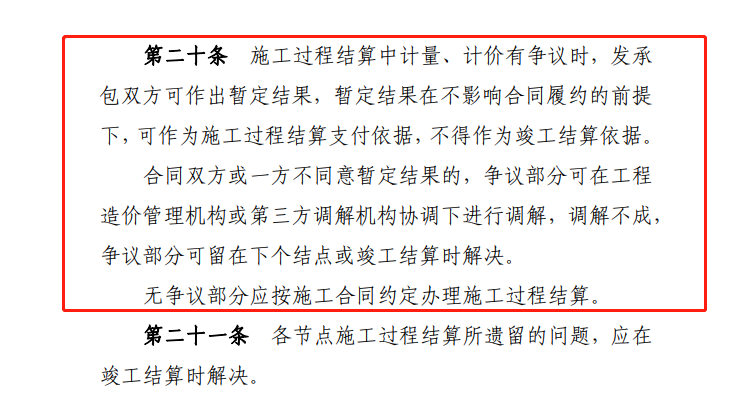 施工過程結(jié)算中計(jì)量、計(jì)價(jià)有爭議和無爭議兩種情形。對于有爭議部分,發(fā)承包雙方可作出暫定結(jié)果,并作為施工過程結(jié)算支付依據(jù),但不得作為竣工結(jié)算依據(jù),最終竣工結(jié)算按照雙方在調(diào)解后確定,或者在下個(gè)結(jié)點(diǎn)或者竣工結(jié)算時(shí)確定。