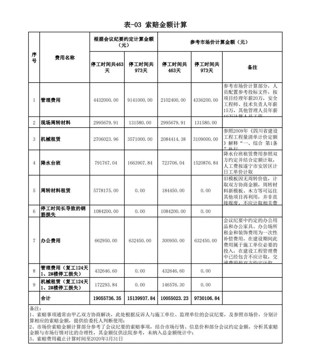 政府與開發(fā)公司之間的合同已解除,但鑒定時(shí),開發(fā)公司與施工單位之間簽訂的施工合同并未解除。項(xiàng)目公司管理費(fèi)的時(shí)間節(jié)點(diǎn)判定就成了一個(gè)難題。鑒定人經(jīng)多次內(nèi)部討論,最終確定:將項(xiàng)目公司管理費(fèi)列為推斷性金額,且根據(jù)不同方案分別統(tǒng)計(jì)金額,提交法院參考(具體數(shù)據(jù)詳表-03):