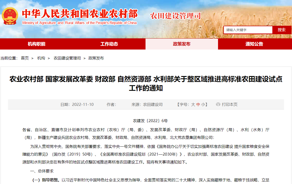 為深入貫徹黨中央、國務(wù)院有關(guān)部署要求,落實中央一號文件精神,依據(jù)《國務(wù)院辦公廳關(guān)于切實加強高標準農(nóng)田建設(shè) 提升國家糧食安全保障能力的意見》(國辦發(fā)〔2019〕50號)、《全國高標準農(nóng)田建設(shè)規(guī)劃(2021—2030年)》,農(nóng)業(yè)農(nóng)村部、國家發(fā)展改革委、財政部、自然資源部和水利部決定在有條件的地區(qū)試點整區(qū)域推進高標準農(nóng)田建設(shè)工作?,F(xiàn)將有關(guān)事項通知如下。