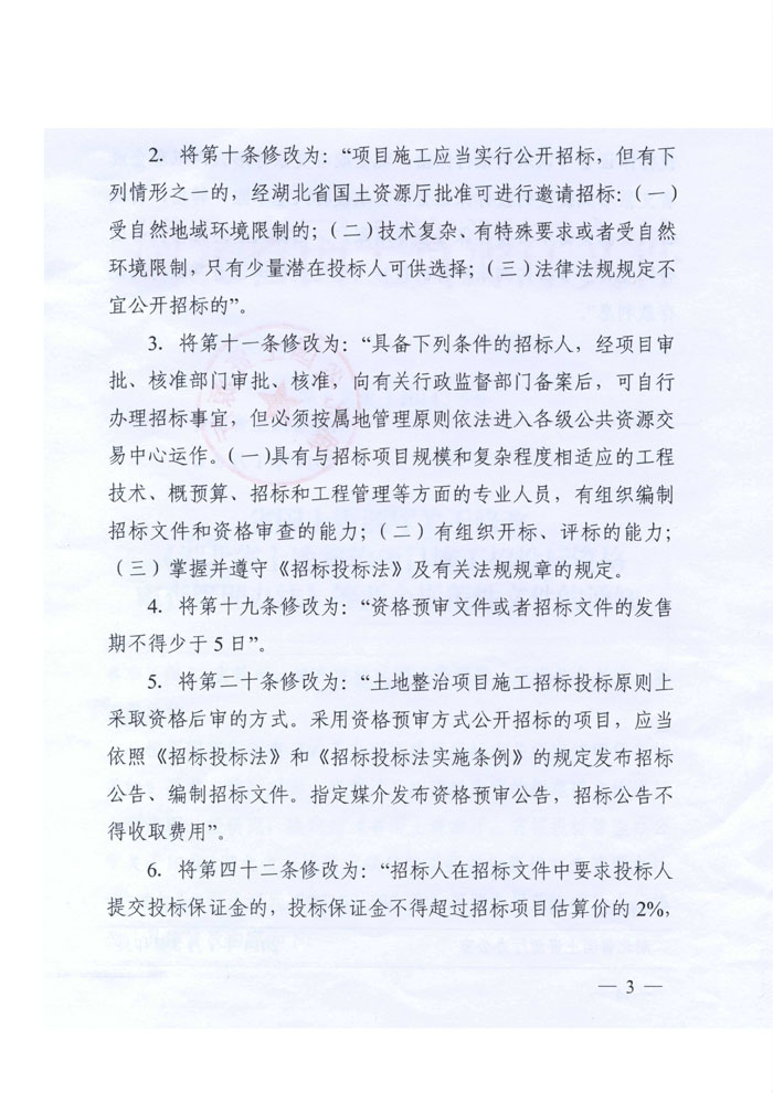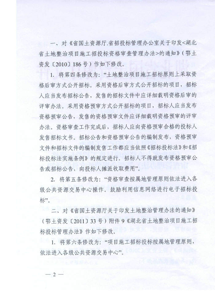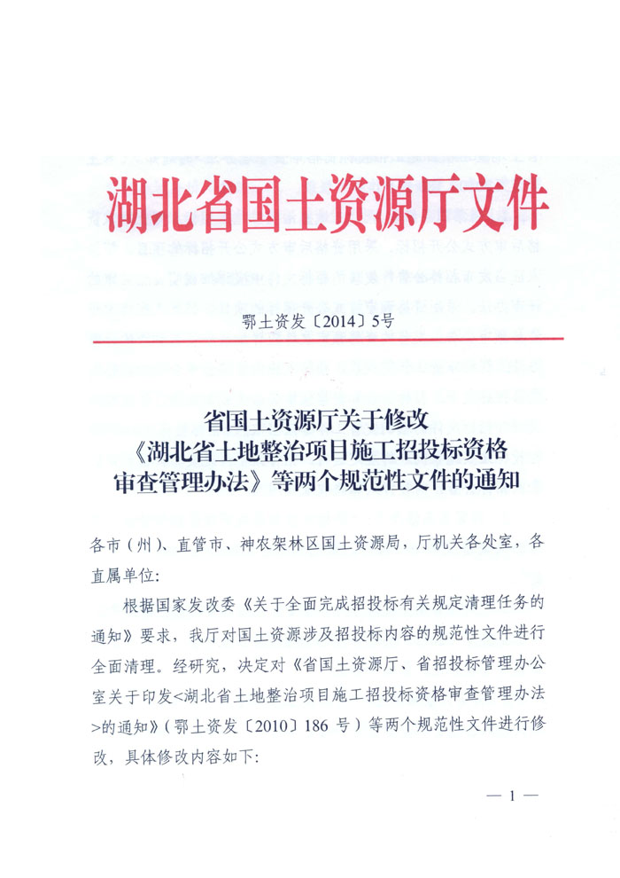 湖北省國土資源廳關(guān)于修改《湖北省土地整治項目施工招投標資格審查辦法》等兩個規(guī)范性文件的通知