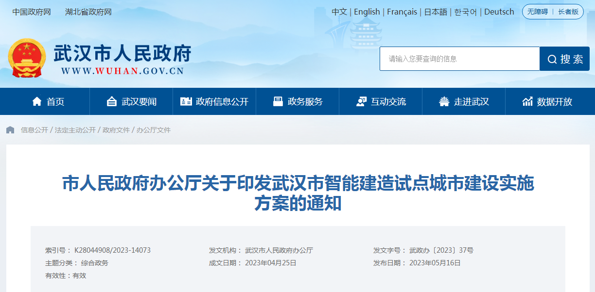武漢市人民政府辦公廳關(guān)于印發(fā)武漢市智能建造試點城市建設(shè)實施方案的通知