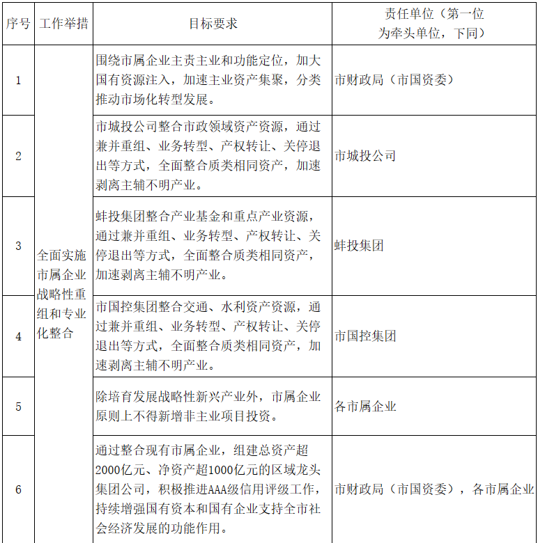 1.全面實(shí)施市屬企業(yè)戰(zhàn)略性重組和專業(yè)化整合。圍繞市屬企業(yè)主責(zé)主業(yè)和功能定位,加大國有資源注入,加速主業(yè)資產(chǎn)集聚,分類推動(dòng)市場化轉(zhuǎn)型發(fā)展。市城投公司整合市政領(lǐng)域資產(chǎn)資源,蚌投集團(tuán)整合產(chǎn)業(yè)基金和重點(diǎn)產(chǎn)業(yè)資源,市國控集團(tuán)整合交通、水利資產(chǎn)資源,通過兼并重組、業(yè)務(wù)轉(zhuǎn)型、產(chǎn)權(quán)轉(zhuǎn)讓、關(guān)停退出等方式,全面整合質(zhì)類相同資產(chǎn),加速剝離主輔不明產(chǎn)業(yè)。除培育發(fā)展戰(zhàn)略性新興產(chǎn)業(yè)外,市屬企業(yè)原則上不得新增非主業(yè)項(xiàng)目投資。在此基礎(chǔ)上,通過整合現(xiàn)有市屬企業(yè),組建總資產(chǎn)超2000億元、凈資產(chǎn)超1000億元的區(qū)域龍頭集團(tuán)公司,積極推進(jìn)AAA級信用評級工作,持續(xù)增強(qiáng)國有資本和國有企業(yè)支持全市社會(huì)經(jīng)濟(jì)發(fā)展的功能作用?!藏?zé)任單位:市財(cái)政局(市國資委),各市屬企業(yè)〕