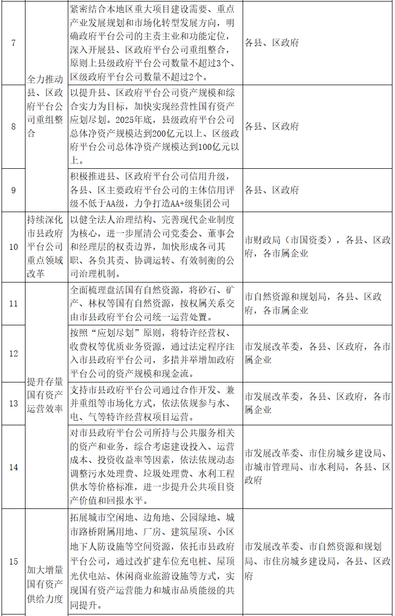 2.全力推動(dòng)縣、區(qū)政府平臺(tái)公司重組整合。各縣、區(qū)政府(市高新區(qū)管委會(huì)、市經(jīng)開區(qū)管委會(huì),下同)要緊密結(jié)合本地區(qū)重大項(xiàng)目建設(shè)需要、重點(diǎn)產(chǎn)業(yè)發(fā)展規(guī)劃和市場化轉(zhuǎn)型發(fā)展方向,明確政府平臺(tái)公司的主責(zé)主業(yè)和功能定位,深入開展縣、區(qū)政府平臺(tái)公司重組整合,充分發(fā)揮資源集聚優(yōu)勢。原則上縣級政府平臺(tái)公司數(shù)量不超過3個(gè)、區(qū)級政府平臺(tái)公司數(shù)量不超過2個(gè)。以提升縣、區(qū)政府平臺(tái)公司資產(chǎn)規(guī)模和綜合實(shí)力為目標(biāo),加快實(shí)現(xiàn)經(jīng)營性國有資產(chǎn)應(yīng)劃盡劃。2025年底,縣級政府平臺(tái)公司總體凈資產(chǎn)規(guī)模達(dá)到200億元以上、區(qū)級政府平臺(tái)公司總體凈資產(chǎn)規(guī)模達(dá)到100億元以上。積極推進(jìn)縣、區(qū)政府平臺(tái)公司信用升級,各縣、區(qū)主要政府平臺(tái)公司的主體信用評級不低于AA級,力爭打造AA+級集團(tuán)公司。(責(zé)任單位:各縣、區(qū)政府)