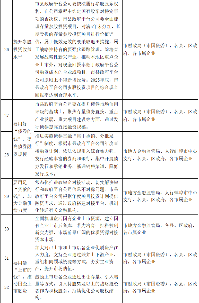 (四)持續(xù)提升融資能力。2025年底,市屬企業(yè)培育2戶以上國有控股企業(yè)在主要資本市場成功上市。市縣政府平臺(tái)公司直接融資規(guī)模超過300億元,間接融資規(guī)模超過400億元。