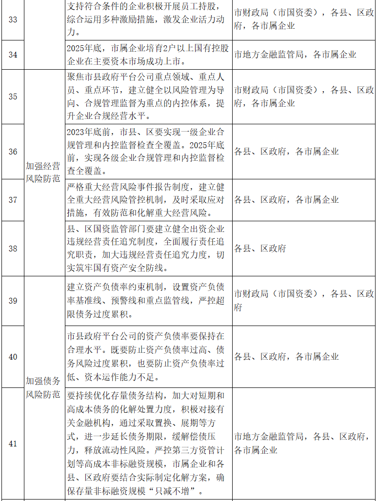 (五)切實(shí)加強(qiáng)風(fēng)險(xiǎn)防范。2025年底,市縣政府平臺(tái)公司實(shí)現(xiàn)對經(jīng)營、債務(wù)、擔(dān)保等全方位、全流程的風(fēng)險(xiǎn)管控,抗風(fēng)險(xiǎn)綜合能力進(jìn)一步增強(qiáng)。企業(yè)合規(guī)管理和內(nèi)控監(jiān)督檢查實(shí)現(xiàn)全覆蓋,合規(guī)經(jīng)營水平切實(shí)提高。存量債務(wù)結(jié)構(gòu)趨于合理,債務(wù)期限和成本進(jìn)一步優(yōu)化。對外擔(dān)保規(guī)??傮w合理,擔(dān)保風(fēng)險(xiǎn)基本可控。政府隱性債務(wù)化解完成既定任務(wù)目標(biāo)。