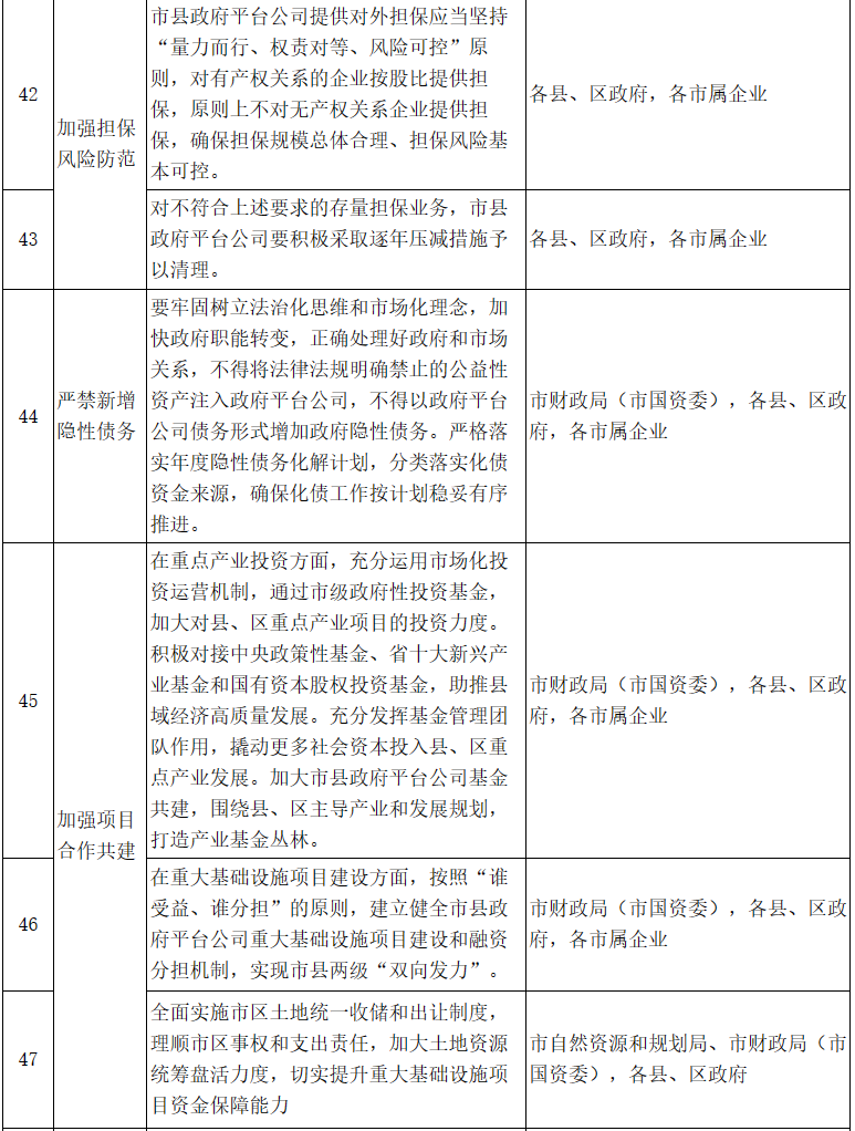 16.嚴(yán)禁新增隱性債務(wù)。要牢固樹立法治化思維和市場化理念,加快政府職能轉(zhuǎn)變,正確處理好政府和市場關(guān)系。不得將法律法規(guī)明確禁止的公益性資產(chǎn)注入政府平臺(tái)公司,不得以政府平臺(tái)公司債務(wù)形式增加政府隱性債務(wù)。嚴(yán)格落實(shí)年度隱性債務(wù)化解計(jì)劃,分類落實(shí)化債資金來源,確?;瘋ぷ靼从?jì)劃穩(wěn)妥有序推進(jìn)?!藏?zé)任單位:市財(cái)政局(市國資委),各縣、區(qū)政府,各市屬企業(yè)〕