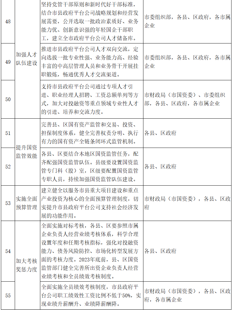18.加強(qiáng)人才隊(duì)伍建設(shè)。堅(jiān)持黨管干部原則和新時(shí)代好干部標(biāo)準(zhǔn),結(jié)合市縣政府平臺(tái)公司戰(zhàn)略規(guī)劃和經(jīng)營發(fā)展需要,公開選取一批政治素質(zhì)好、業(yè)務(wù)能力優(yōu)、創(chuàng)新意識強(qiáng)的年輕國企干部職工,建立全市政府平臺(tái)公司人才儲(chǔ)備庫。推進(jìn)市縣政府平臺(tái)公司人才雙向交流,定向選拔一批專業(yè)性強(qiáng)、業(yè)務(wù)能力高、經(jīng)驗(yàn)豐富的中高層管理人員和業(yè)務(wù)骨干開展掛職鍛煉,暢通優(yōu)秀人才交流渠道。支持市縣政府平臺(tái)公司通過專項(xiàng)人才引進(jìn)、職業(yè)經(jīng)理人招聘、工資總額單列等方式,加大對投融資等重點(diǎn)領(lǐng)域?qū)I(yè)性人才的引進(jìn)、培養(yǎng)和交流力度?!藏?zé)任單位:市委組織部、市財(cái)政局(市國資委),各縣、區(qū)政府,各市屬企業(yè)〕