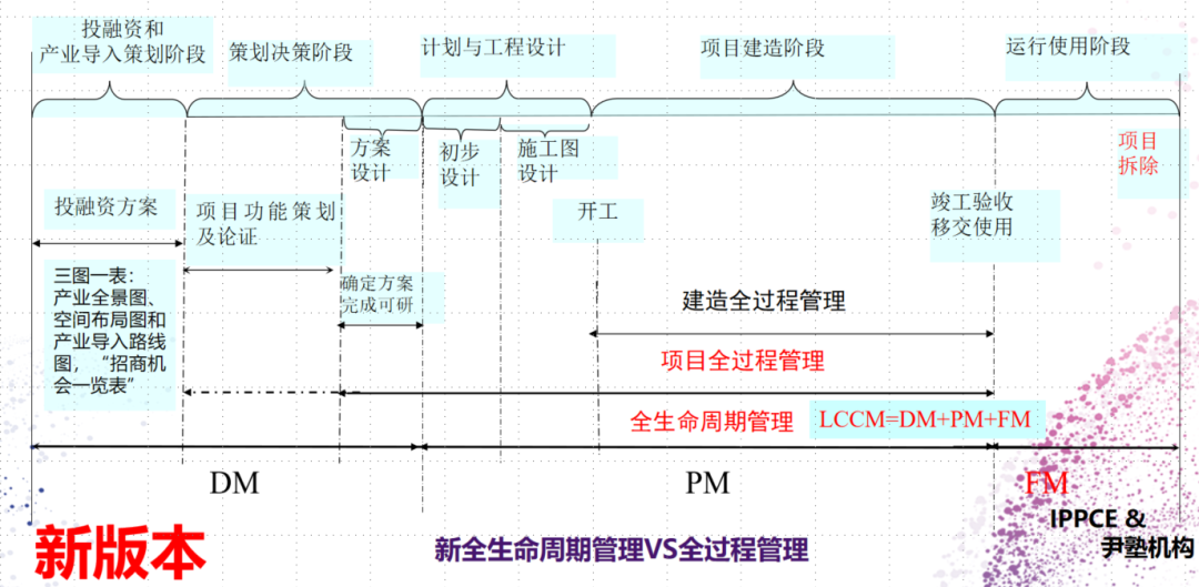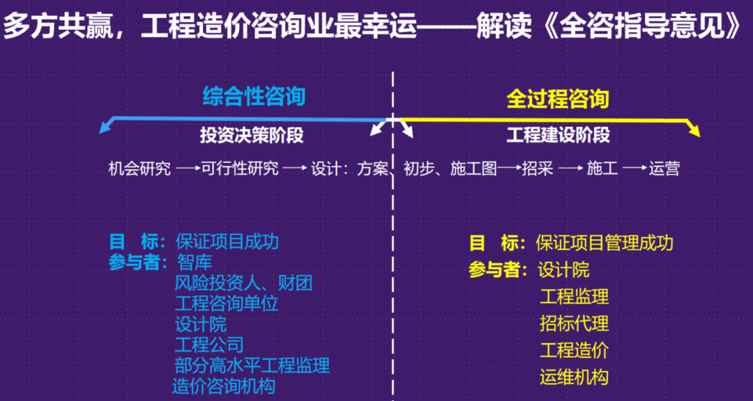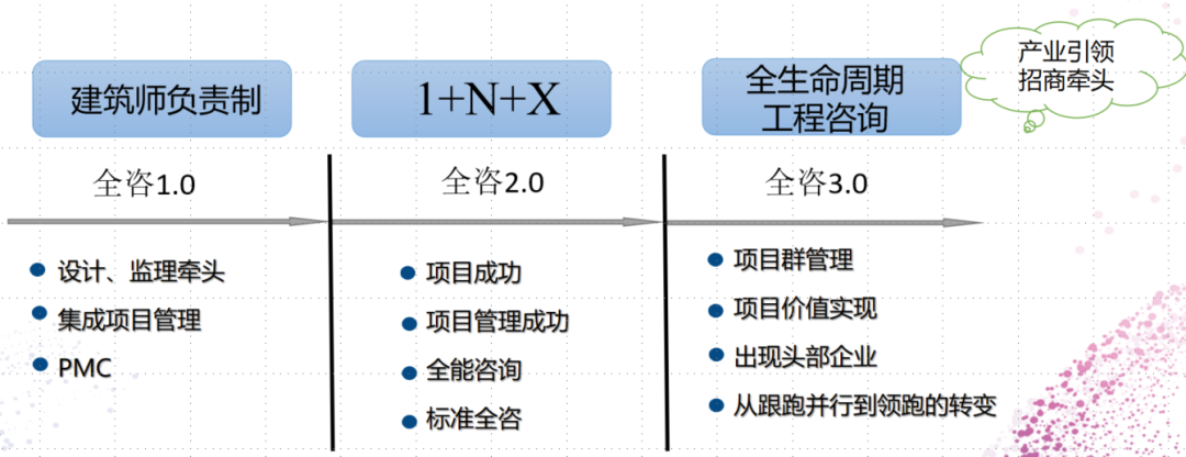 在總書(shū)記全生命周期管理思想的指導(dǎo)下,中國(guó)的“全咨”已經(jīng)由“全過(guò)程工程咨詢”過(guò)渡到“全生命周期工程咨詢”,進(jìn)入了全咨3.0時(shí)代。全咨3.0要點(diǎn)是全咨邊界向前擴(kuò)展到“招商引資”,向后延伸至“運(yùn)營(yíng)維護(hù)”。