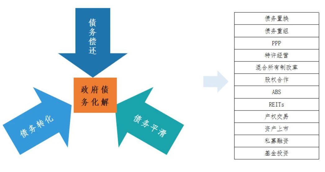 結(jié)合國家相關(guān)政策、學(xué)術(shù)理論以及實踐經(jīng)驗,我們提出了圍繞“債務(wù)平滑、債務(wù)轉(zhuǎn)化、債務(wù)償還”三大策略方向,主要運(yùn)用“債務(wù)置換、債務(wù)重組、PPP、特許經(jīng)營、混合所有制改革、股權(quán)合作、ABS、REITs、產(chǎn)權(quán)交易、資產(chǎn)上市、私募融資、基金投資”十二種工具,建立明確的債務(wù)化解規(guī)劃,制定分年度債務(wù)化解目標(biāo),切實有效實現(xiàn)政府隱性債的化解,促進(jìn)地方政府投融資運(yùn)作健康可持續(xù)。