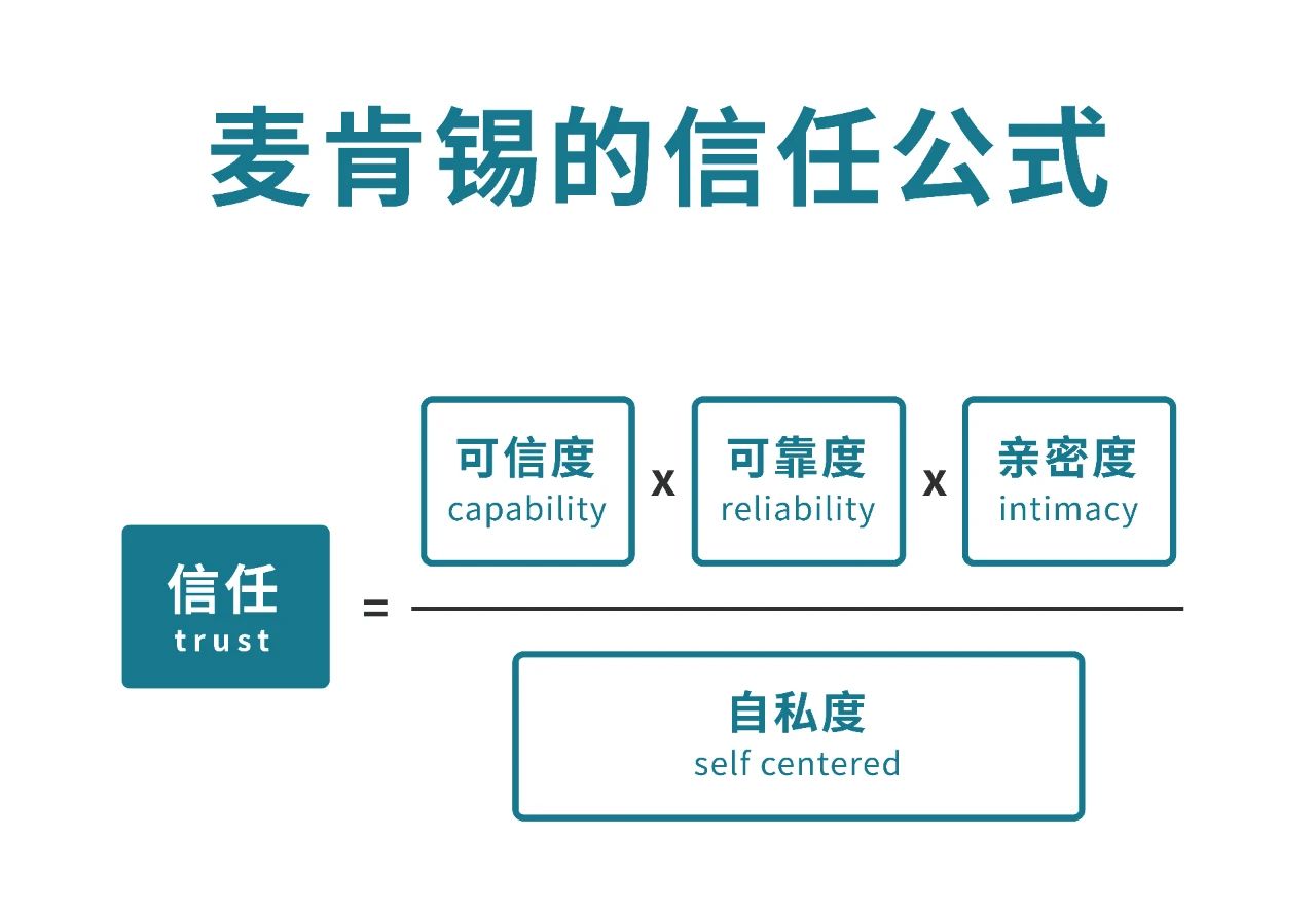 麥肯錫信任公式為我們對信任度進行量化評估提供了指導框架。根據(jù)影響信任的4個因素,我們了解到,信任是藏在尋常日子里的點滴小事,也是在一件又一件的小事情中積累起來的一種相互關(guān)系。