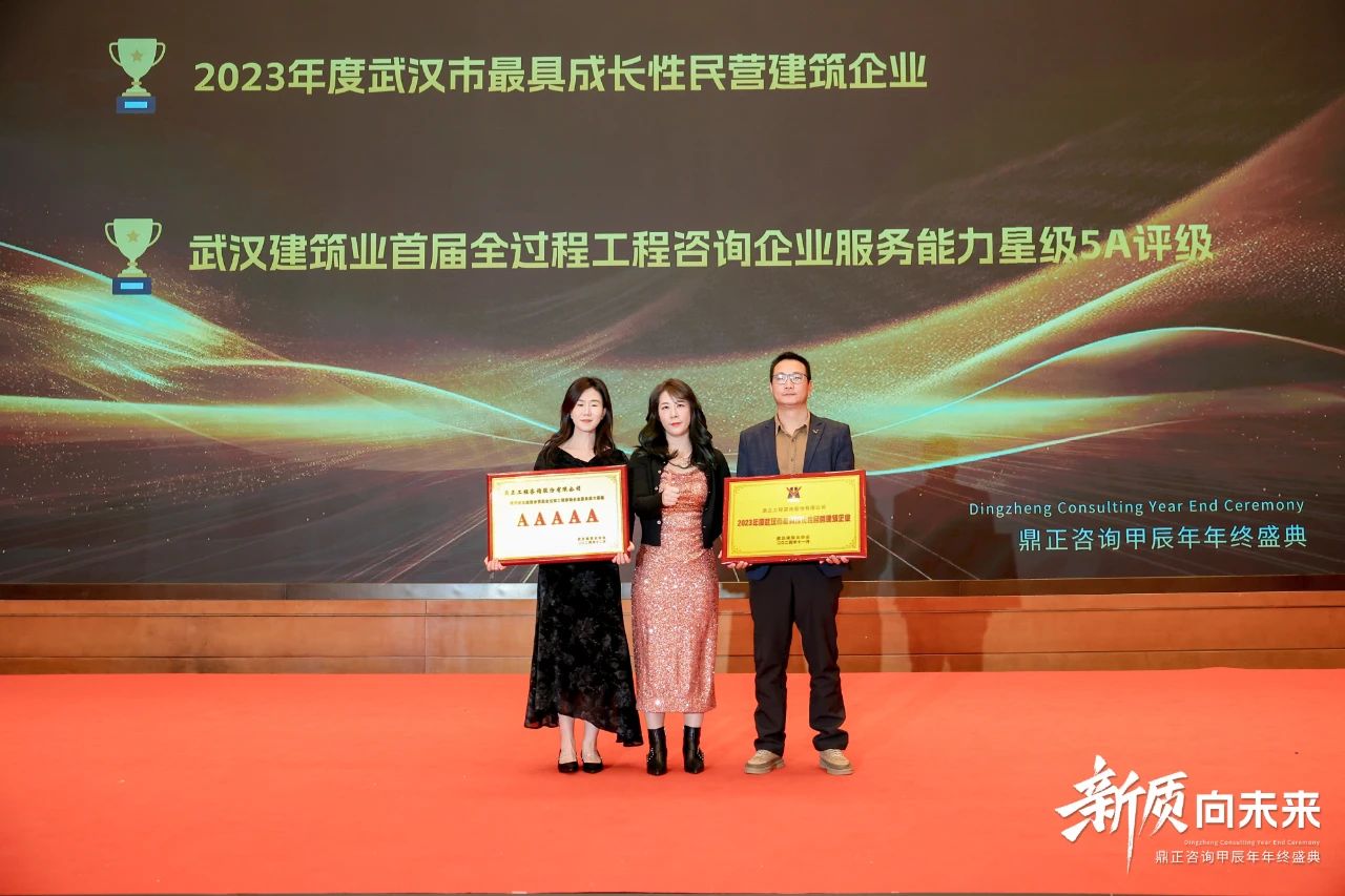 在過去的一年里,鼎正在專家輔助人、專項債、超長期特別國債、中央預算內(nèi)資金、全過程工程咨詢等業(yè)務板塊中,展現(xiàn)出強勁的創(chuàng)新力,并獲得行業(yè)廣泛的認可。當晚,武漢建筑業(yè)協(xié)會領導代表、全咨分會秘書長陳金琳女士,為我們頒發(fā)了2023年度武漢市最具成長性民營建筑企業(yè)、武漢建筑業(yè)首屆全過程工程咨詢企業(yè)服務能力星級5A評級兩項榮譽。