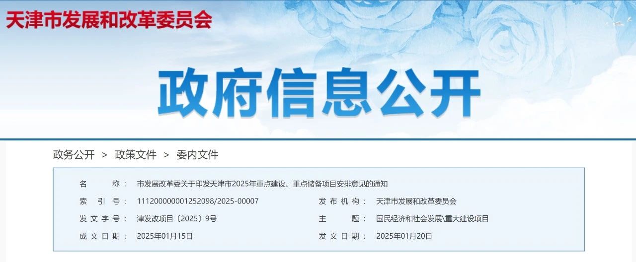 天津市發(fā)展改革委發(fā)布2025年重點(diǎn)建設(shè)、重點(diǎn)儲備項目安排意見,共計1129個項目、總投資2.02萬億元。其中,包括重點(diǎn)建設(shè)項目854個,總投資1.52萬億元,年度計劃投資2209.07億元,均為在建續(xù)建或即將開工項目;重點(diǎn)儲備項目275個,總投資4992.26億元。