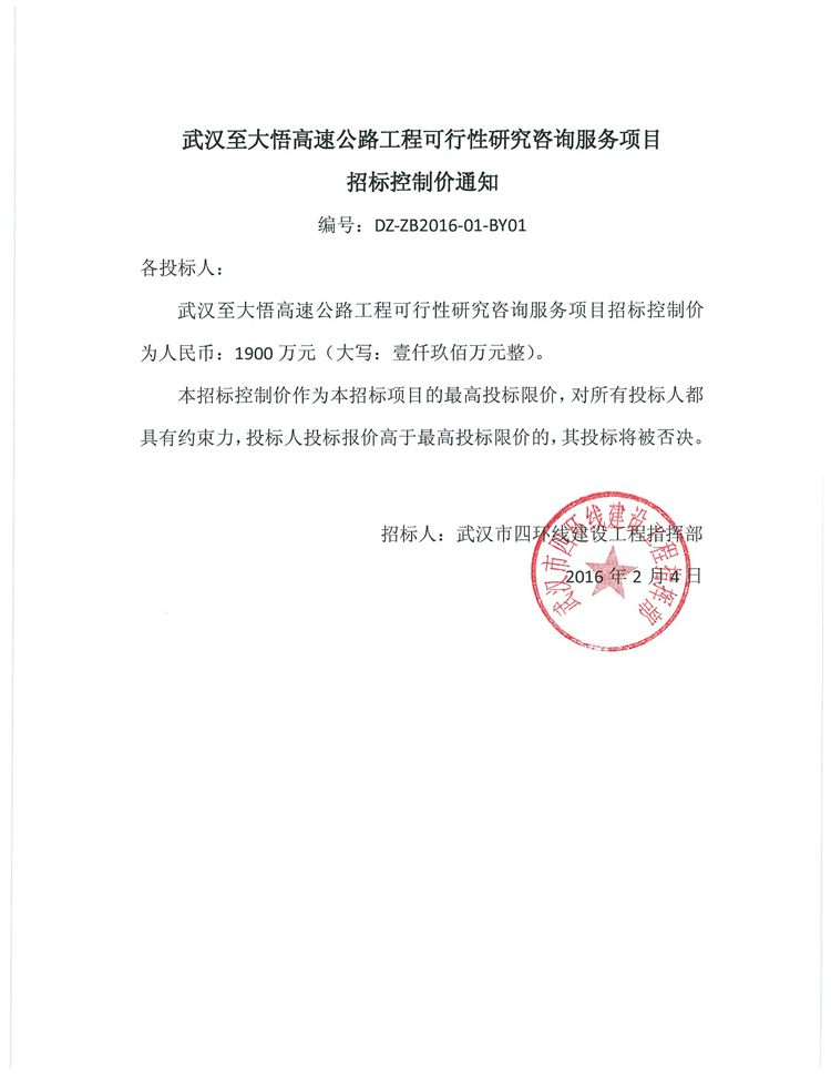 武漢至大悟高速公路工程可行性研究咨詢服務(wù)項目招標控制價通知