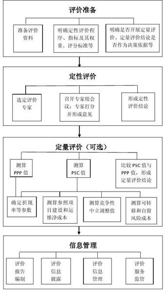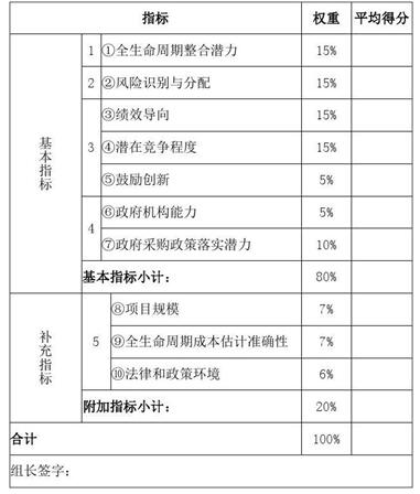 (二)評價(jià)方法。主要包括定性評價(jià)程序、指標(biāo)及權(quán)重、評分標(biāo)準(zhǔn)、評分結(jié)果、專家組意見以及定量評價(jià)的PSC值、PPP值的測算依據(jù)、測算過程和結(jié)果等。