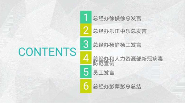 本次會議由人力資源部譚蓉主持,每位同事從自己的生活狀態(tài)到對工作的匯報和對戰(zhàn)勝疫情的決心中娓娓而談,閑話家談中表達出自己對未來生活的美好祝愿。